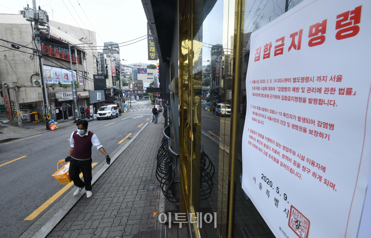 서울 이태원 클럽발 신종 코로나바이러스 감염증(코로나19) 집단 감염 등의 영향으로 코로나19 재확산 우려가 커지고 있는 가운데 10일 서울 용산구 이태원의 한 클럽 입구에 집합금지 명령문이 붙어있다. 질병관리본부에 따르면 이날 코로나19 확진 환자는 34명으로 26명은 지역사회 감염 사례였고 해외 입국 확진자는 8명이었다. 하루 신규 환자가 30명을 넘은 건 지난달 12일 32명 이후 28일 만이다.