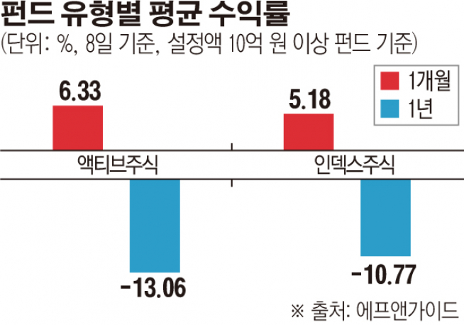 11일 금융정보업체 에프앤가이드가 지난 8일 기준 국내 설정액 10억 원 이상 펀드의 수익률을 집계한 결과 국내주식형 액티브펀드 572개의 최근 1개월 평균 수익률은 6.33%다. 반면 같은 기간 국내주식형 인덱스펀드 386개의 수익률은 평균 5.18%다.