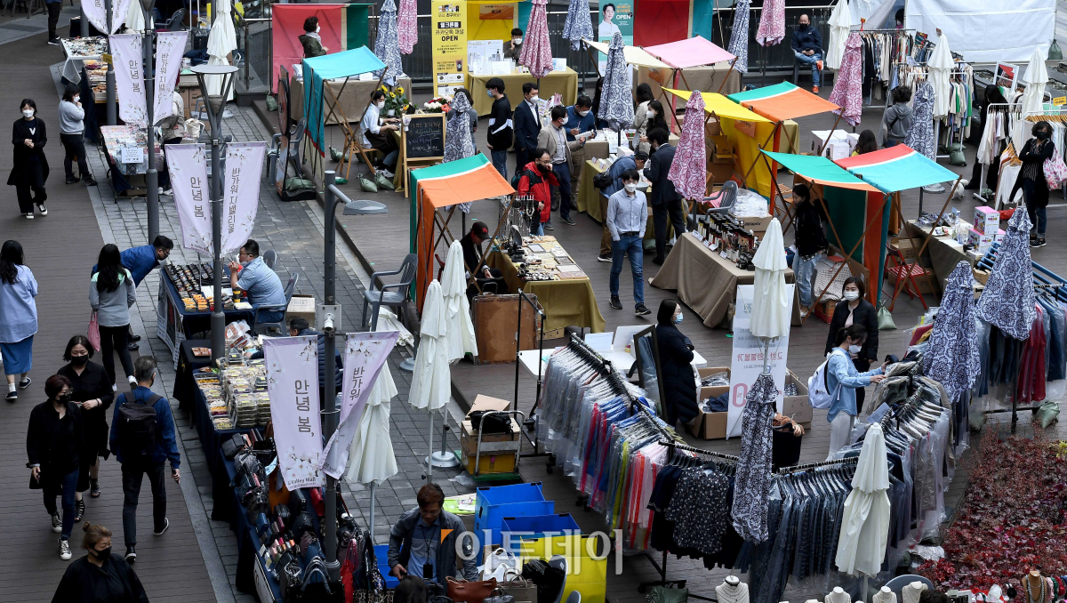 12일 서울 구로구 디지털로 지밸리몰에서 열린 ‘코로나19 극복을 위한 G밸리 희망나눔 바자회’에서 시민들이 바자회 물품을 살펴보고 있다. 구로구 주최로 오는 15일 까지 열리는 이번 바자회에선 여성의류, 미용·건강제품 등 1300여 점이 저렴하게 판매되며 마련된 수익금과 기부 물품은 코로나19로 어려움을 겪고 있는 지역사회 취약계층을 위한 지원사업에 사용된다.