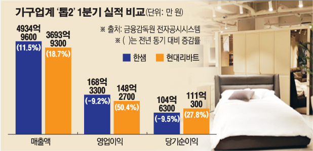 가구업계 ‘톱 2’인 한샘과 현대리바트의 1분기 실적에서 희비가 갈렸다. 신종 코로나바이러스 감염증(코로나19) 영향이 상대적으로 적었던 현대리바트는 호실적을 기록했지만, 한샘은 일회성 비용이 늘면서 실적이 소폭 감소하면서다.
