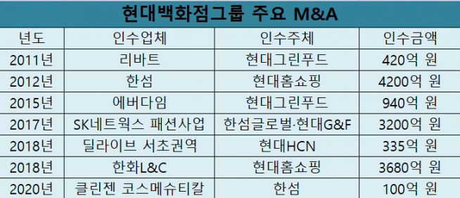 실제 현대백화점그룹은 코로나19 등 어려운 투자환경 속에서도 올 초부터 M&A 시장에 이름을 올리고 있다. 현대HCN의 방송·통신 사업부문을 분할해 매각을 진행 중이며, 최근에는 그룹의 계열사 한섬이 100억 원 규모의 기능성 화장품 전문기업 `클린젠 코스메슈티칼(클린젠)` 지분 51%를 인수해 화장품 사업에 진출한다고 밝혔다. 연초에는 제약사업 인수를 위한 프로젝트펀드의 LP(유한책임사원) 출자를 검토하기도 한 것으로 알려졌다.