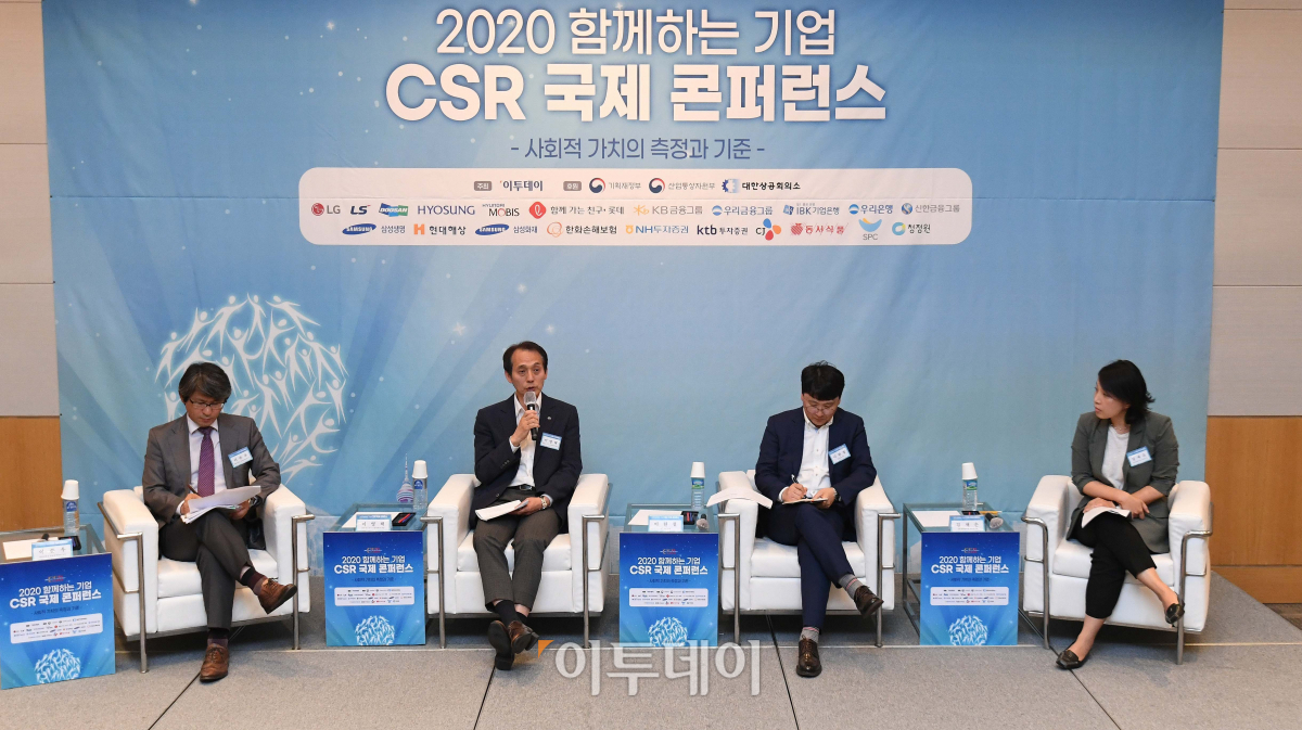 13일 서울 여의도 전경련회관에서 열린 ‘2020 함께하는 기업 CSR 국제 콘퍼런스’에서 이준우(왼쪽부터) 한밭대 경영회계학과 교수, 이영태 한국가스공사 상생협력처장, 이현철 화진산업 대표, 김재은 산업정책연구원 상임연구원이 패널토론에 참여하고 있다. 이투데이가 기업의 사회적 책임(CSR)의 사회적 가치 측정방법과 기준 등을 주제로 개최한 이번 국제 콘퍼런스는 신종 코로나바이러스 감염증(코로나19) 영향으로 유튜브·페이스북 등을 통해 녹화 중계된다.