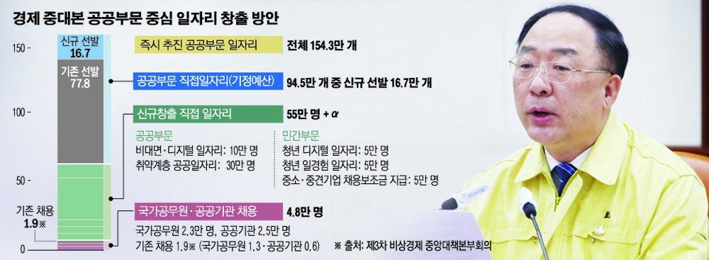 정부가 신종 코로나바이러스 감염증(코로나19) 확산으로 중단했던 재정일자리 공급과 공공부문 신규채용을 재개한다. 앞서 발표한 ‘직접일자리 55만 개+알파(α)’ 공급에도 속도를 낸다. 기존에 채용한 공무원까지 더하면 총 재정·공공일자리 공급량은 156만 개가 넘는다.
