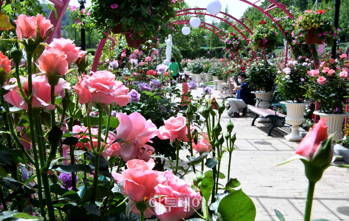 ‘생활 속 거리두기’로 일상으로의 복귀가 차분하게 진행되는 가운데 전국이 완연한 봄날씨를 보인 14일 경기 용인시 처인구 에버랜드 장미원을 찾은 시민들이 장미를 관람하며 계절의 여왕 5월을 즐기고 있다. 에버랜드는 오는 15일부터 한 달여 간 약 2만㎡ 규모의 장미원에 720종 300만 송이의 장미가 만개할 것으로 예상했다.