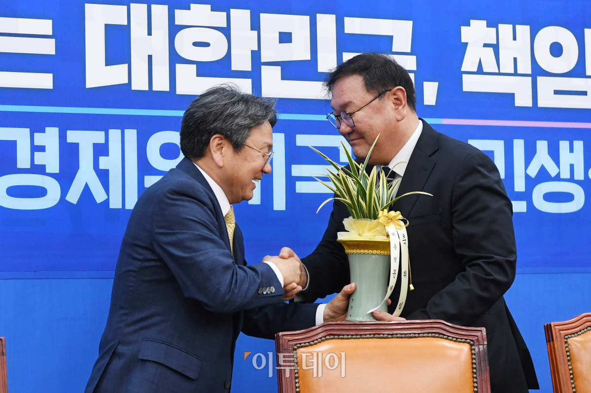 김태년(오른쪽) 더불어민주당 원내대표가 15일 서울 여의도 국회에서 강기정 청와대 정무수석에게 문재인 대통령의 취임 축하난을 받고 있다.
