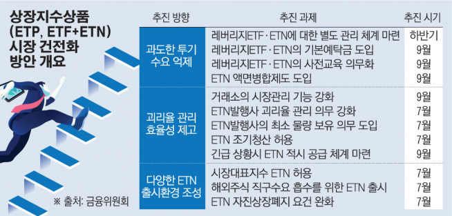 금융위원회는 17일 이 같은 내용을 골자로 한 ‘ETFㆍETN 시장 건전화 방안’을 발표했다. 최근 원유 선물 레버리지 ETN 등에 대한 투기 광풍으로 투자 위험성이 커지자 이에 대응하는 조치를 마련한 것이다.