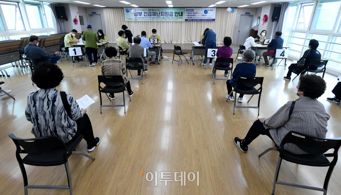신종 코로나바이러스 감염증(코로나19) 대응을 위한 긴급재난지원금 오프라인 신청 첫날인 18일 서울 성동구 금호2.3가동주민센터에서 시민들이 긴급재난지원금 신청을 하고 있다. 이날부터 재난지원금 지역사랑상품권·선불카드 신청을 전국 읍·면·동 주민센터에서 받고, 그간 온라인으로 접수해온 신용·체크카드 충전 방식도 각 카드사 연계 은행 창구를 통한 방문 신청이 가능하다. 신청이 몰리지 않도록 공적 마스크 판매처럼 요일제가 적용된다.