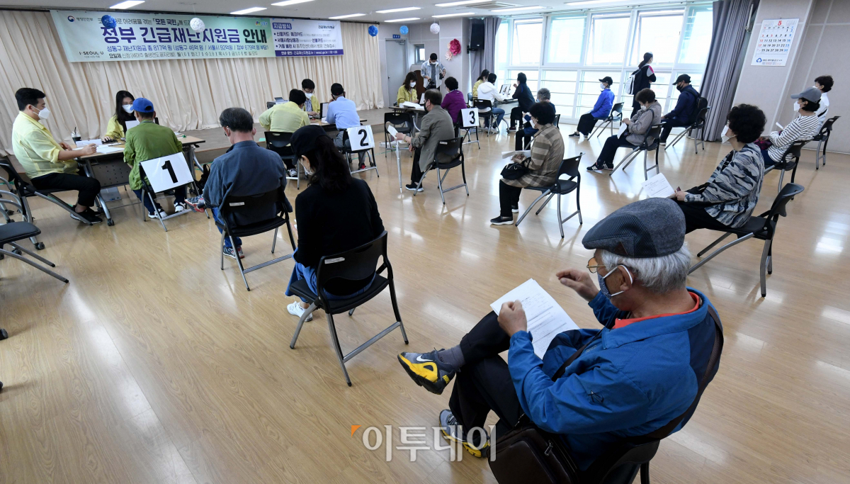 신종 코로나바이러스 감염증(코로나19) 대응을 위한 긴급재난지원금 오프라인 신청 첫날인 18일 서울 성동구 금호2.3가동주민센터에서 시민들이 긴급재난지원금 신청을 하고 있다. 이날부터 재난지원금 지역사랑상품권·선불카드 신청을 전국 읍·면·동 주민센터에서 받고, 그간 온라인으로 접수해온 신용·체크카드 충전 방식도 각 카드사 연계 은행 창구를 통한 방문 신청이 가능하다. 신청이 몰리지 않도록 공적 마스크 판매처럼 요일제가 적용된다.