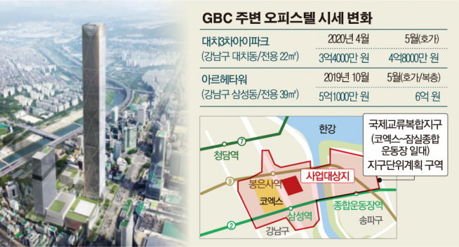 대치동 B공인중개업소 관계자는 "GBC가 완공되면 현대차 등 임직원 입주 수요가 늘 것이란 생각엔 오피스텔 매입 문의가 많이 오고 있다. 보유자들도 가격을 높여 부르고 있다"고 말했다. 그는 "GBC, 삼성역과 가까운 삼성동 상업용지 가운데는 오피스텔을 지을 수 있는 여유가 거의 없다"며 "희소성이 부각되면서 가격이 더 오르고 있다"고 설명했다.