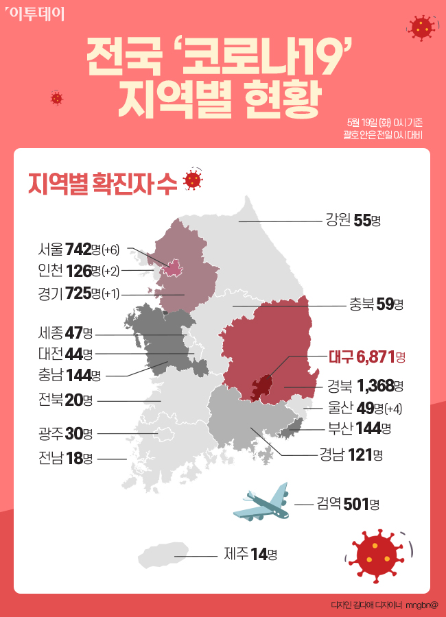 이로써 전국 시·도별 '코로나19' 확진자 수는 △대구 6871명 △경북 1368명으로 가장 많은 비중을 차지했다. 이어 △서울 742명 △경기 725명 △검역소 501명 △부산 144명 △충남 144명 △인천 126명 △경남 121명 △충북 59명 △강원 55명 △울산 49명 △세종 47명 △대전 44명 △광주 30명 △전북 20명 △전남 18명 △제주 14명 순으로 나타났다.