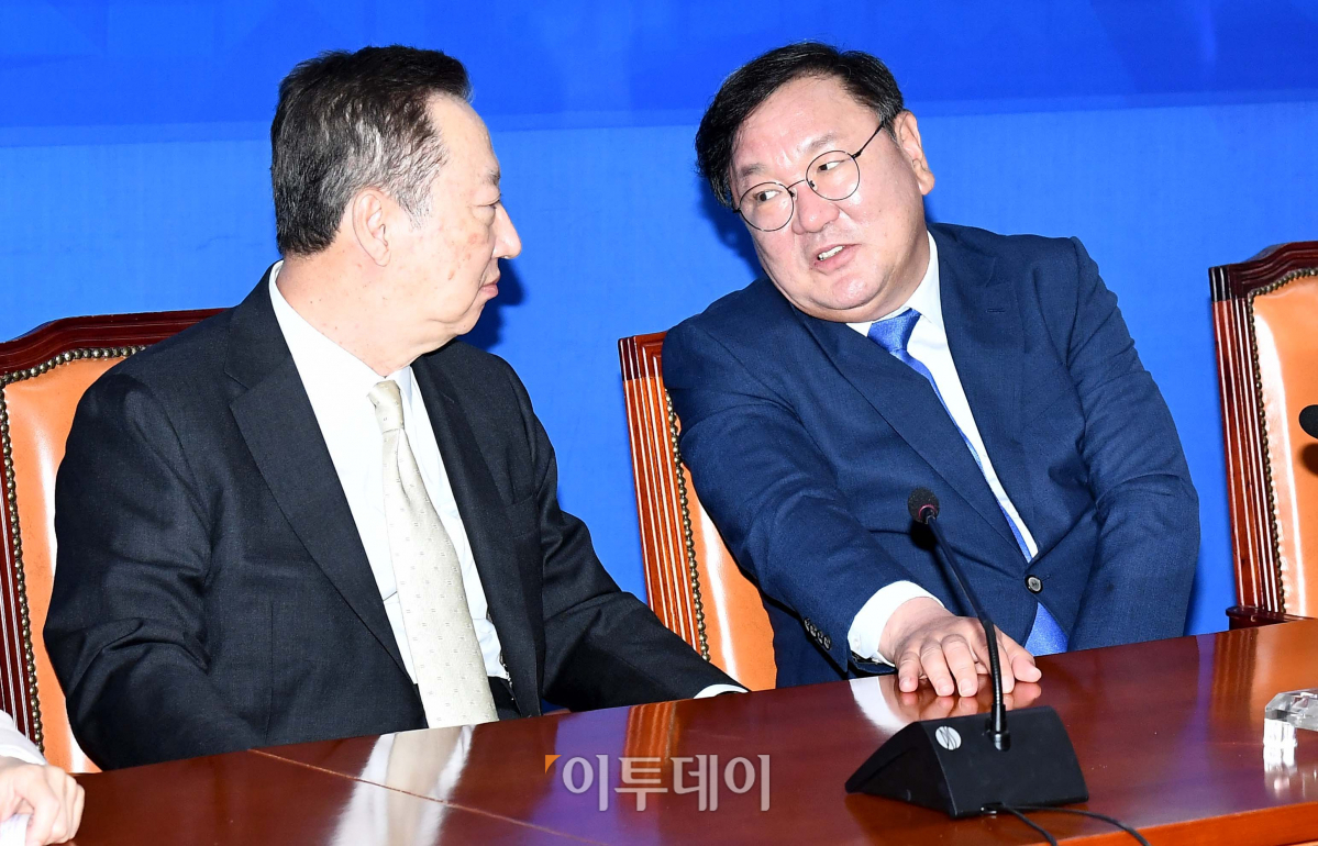 김태년(오른쪽) 더불어민주당 원내대표가 19일 서울 여의도 국회에서 박용만 대한상공회의소 회장의 예방을 받은 뒤 대화하고 있다.