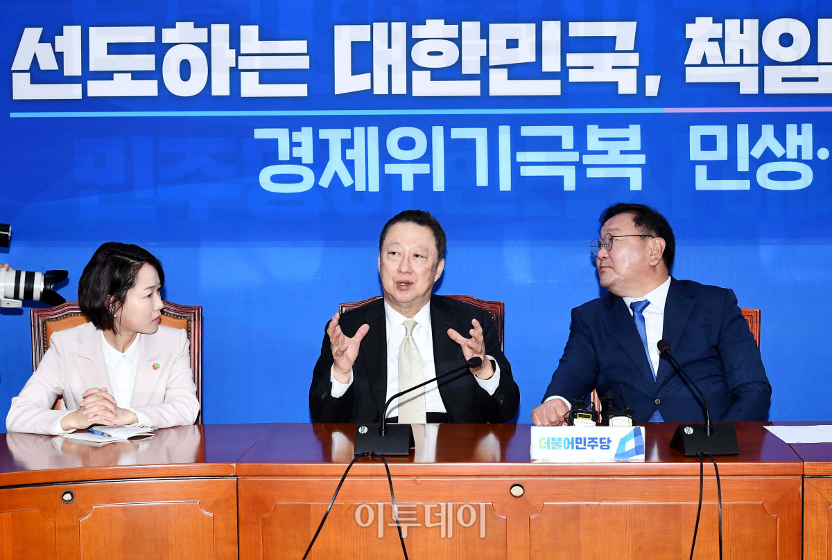 박용만 대한상공회의소 회장이 19일 서울 여의도 국회에서 김태년 더불어민주당 원내대표를 예방한 뒤 발언하고 있다.