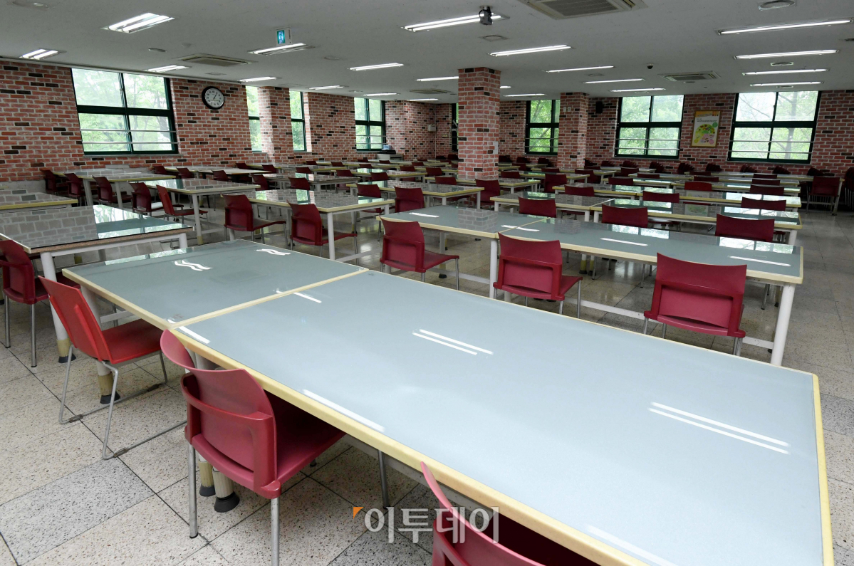 고3 학생의 등교 개학을 하루 앞둔 19일 서울 영등포구 여의도고 급식실 좌석이 널찍이 떨어진채 한방향으로 배치돼 있다. 20일 고3에 이어 고2·중3·초1~2·유치원생은 27일, 고1·중2·초3~4학년은 6월3일, 중1과 초5~6학년은 6월8일에 등교한다. 학생들은 학교에서 점심식사 등 불가피한 경우를 제외하고는 항상 마스크를 착용해야 한다.