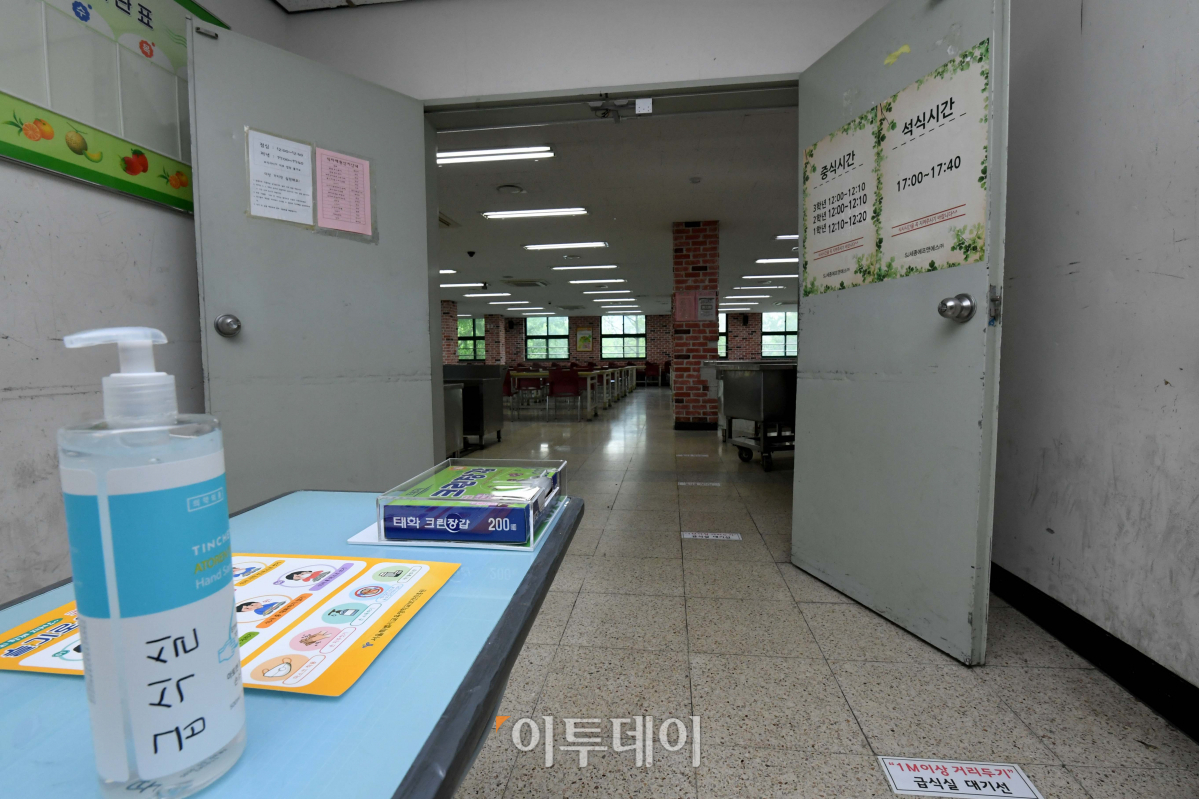 고3 학생의 등교 개학을 하루 앞둔 19일 서울 영등포구 여의도고 급식실 입구에 손소독제가 구비돼 있다. 20일 고3에 이어 고2·중3·초1~2·유치원생은 27일, 고1·중2·초3~4학년은 6월3일, 중1과 초5~6학년은 6월8일에 등교한다. 학생들은 학교에서 점심식사 등 불가피한 경우를 제외하고는 항상 마스크를 착용해야 한다.