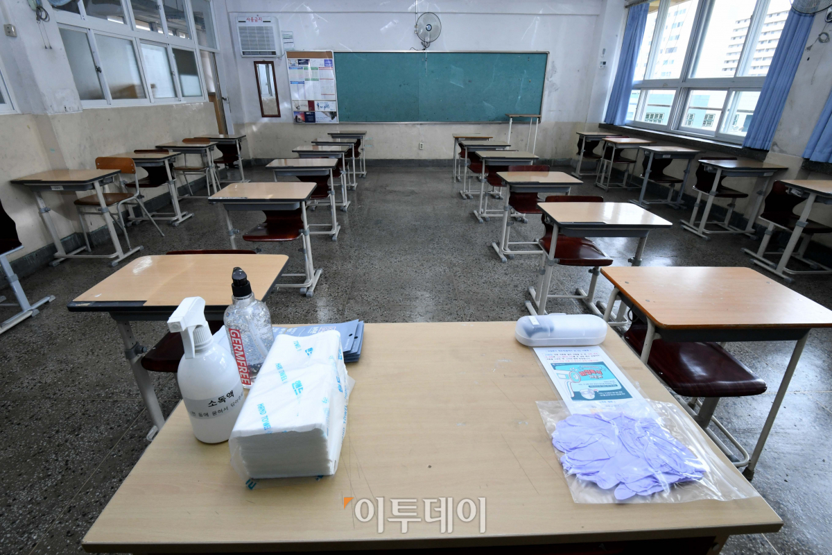 고3 학생의 등교 개학을 하루 앞둔 19일 서울 영등포구 여의도고 3학년 교실에 방역용품이 놓여 있다. 20일 고3에 이어 고2·중3·초1~2·유치원생은 27일, 고1·중2·초3~4학년은 6월3일, 중1과 초5~6학년은 6월8일에 등교한다. 학생들은 학교에서 점심식사 등 불가피한 경우를 제외하고는 항상 마스크를 착용해야 한다.
