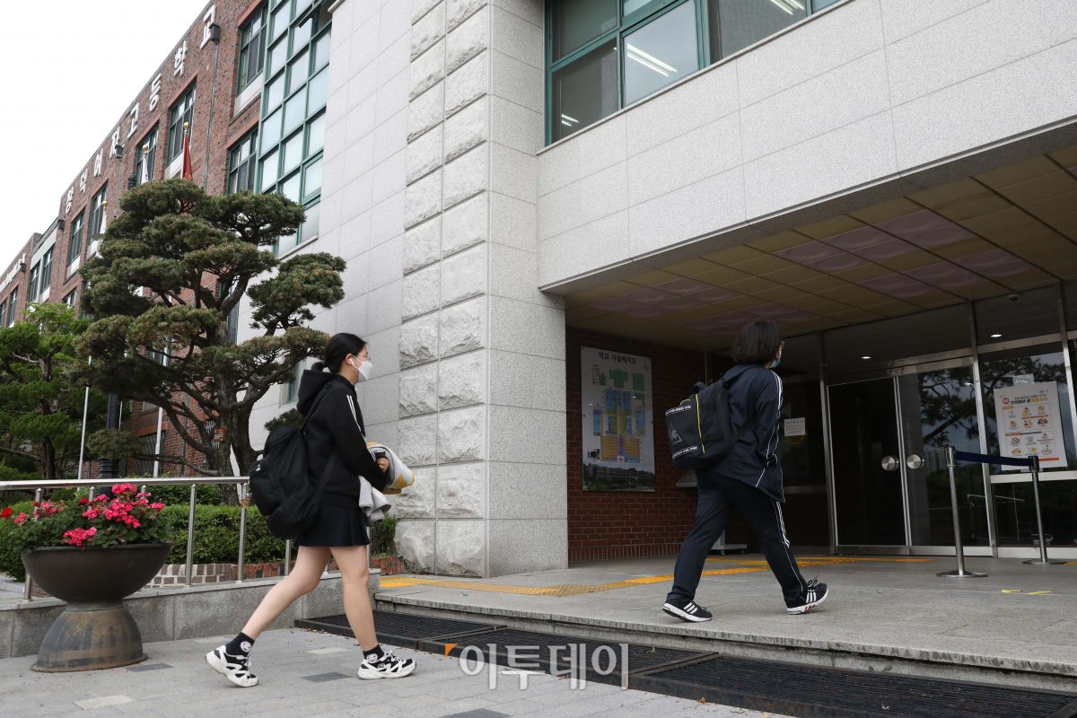 신종 코로나바이러스 감염증(코로나19) 여파로 80일 만에 고3 학생의 등교 수업이 시작된 20일 서울 송파구 창덕여고에서 학생들이 교실로 향하고 있다.