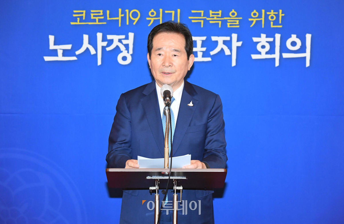 정세균 국무총리가 20일 서울 종로구 삼청동 총리공관에서 열린 코로나19 위기 극복을 위한 노사정 대표자 회의에서 모두발언을 하고 있다.