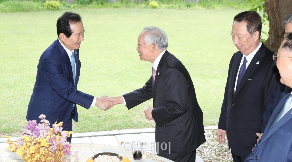 정세균(왼쪽) 국무총리와 손경식 경총 회장이 20일 서울 종로구 삼청동 총리공관에서 열린 코로나19 위기 극복을 위한 노사정 대표자 회의에 앞서 악수하고 있다.