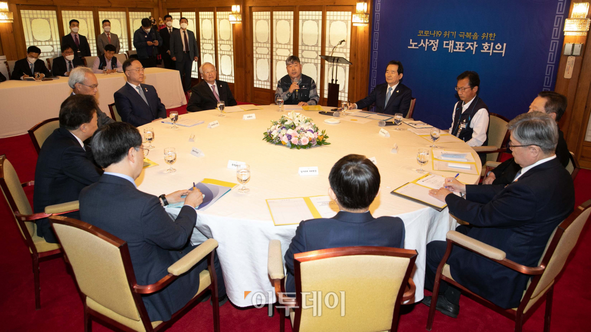 김동명 한국노총 위원장이 20일 서울 종로구 삼청동 총리공관에서 열린 코로나19 위기 극복을 위한 노사정 대표자 회의에서 발언하고 있다.