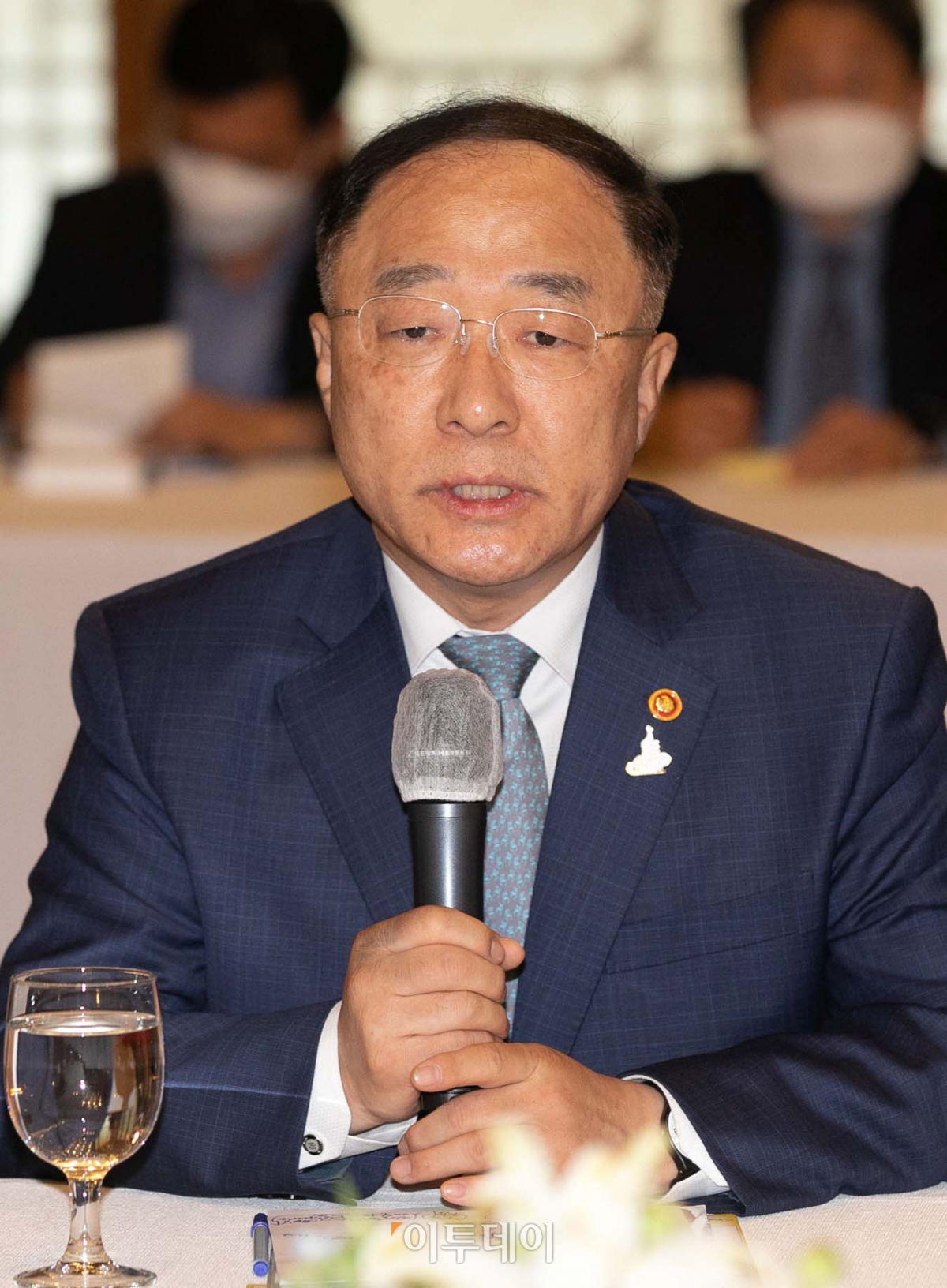 홍남기 부총리 겸 기획재정부 장관이 20일 서울 종로구 삼청동 총리공관에서 열린 코로나19 위기 극복을 위한 노사정 대표자 회의에서 발언하고 있다.