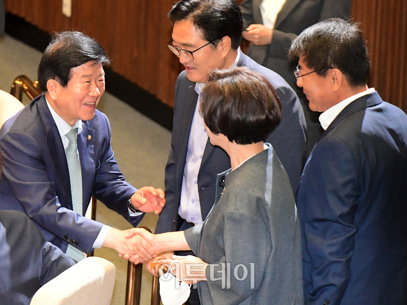 21대 국회 첫 국회의장으로 사실상 확정된 박병석(왼쪽) 더불어민주당 의원이 20일 서울 여의도 국회에서 본회의에 앞서 국회부의장 후보 등록을 마친 김상희 의원과 악수를 하고 있다. 고이란 기자 photoeran@
