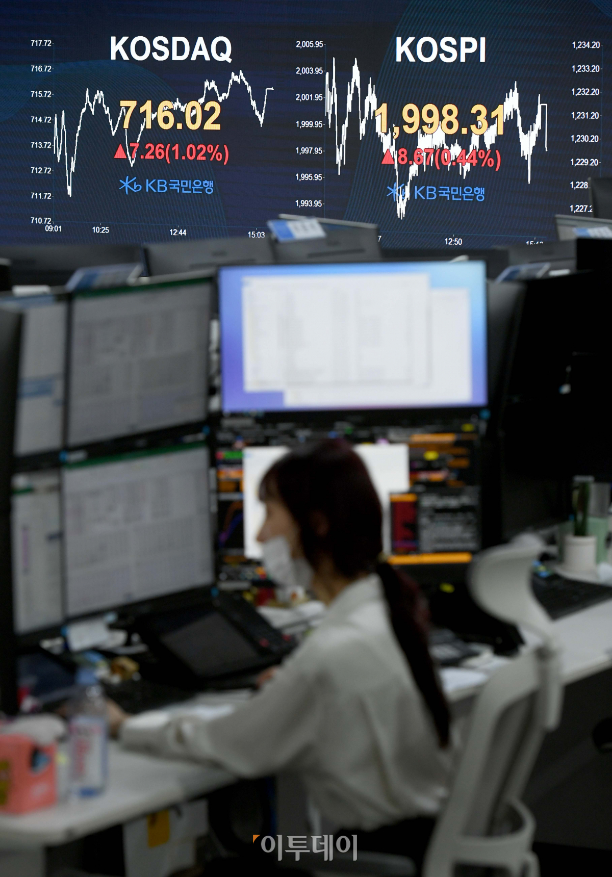 장중 2000선을 넘어섰던 코스피가 1990대로 마감한 21일 서울 여의도 KB국민은행 스마트딜링룸 전광판에 코스피가 전 거래일보다 8.68포인트(0.44%)오른 1998.32를 가리키고 있다.