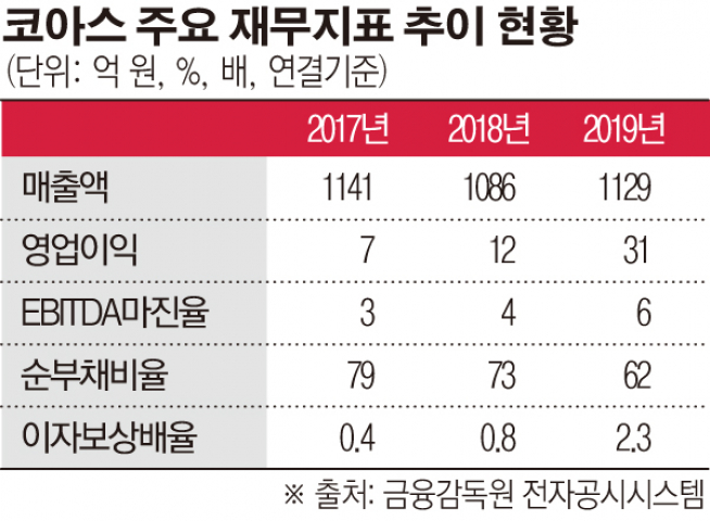 24일 금융감독원 전자공시에 따르면, 코아스의 지난해 연결기준 매출액은 전년 동기 대비 3.9% 증가한 1129억 원, 영업이익은 150.1% 오른 31억 원을 기록했다. 영업활동현금흐름도 2017년 -13억 원→2018년 29억 원→2019년 49억 원으로 개선됐다. 흑자를 기록하면서 이자보상배율(2.3)은 4년 만에 1을 넘어섰다.