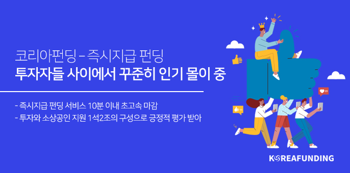 코리아펀딩 관계자는 “즉시지급 펀딩의 수요가 높아진 만큼 투자 모집 금액을 더욱 확대해 보다 많은 투자자들이 투자 기회를 얻으실 수 있도록 구성해 나갈 것"이라고 말했다.