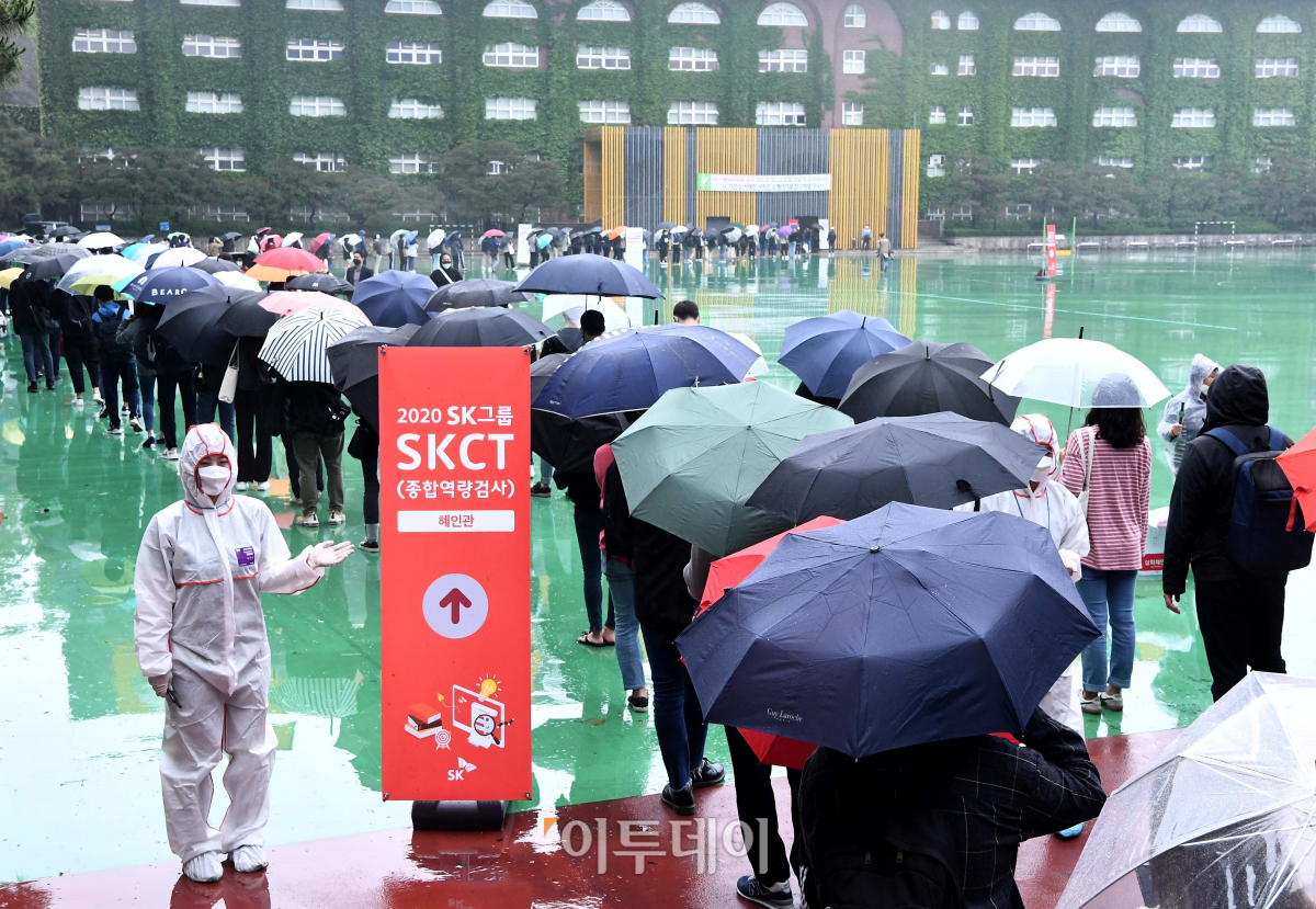 신종 코로나바이러스 감염증(코로나19) 여파로 잠잠했던 기업 채용이 다시 기지개를 켜고 있다. 24일 서울 성북구 서경대에서 열린 SK그룹 상반기 대졸 신입사원 공개채용 필기시험 종합역량검사(SKCT)를 치르기 위해 응시자들이 고사장으로 입장하고 있다. SK하이닉스·SK이노베이션·SK텔레콤·SK브로드밴드·SK매직 지원자를 대상으로 시행된 이날 SKCT는 고사장에 각각 2m의 거리를 두고 좌석이 배치됐으며, 응시자들은 마스크와 장갑을 낀 채 시험을 치렀다. 시험 전후엔 방역이 진행됐다.