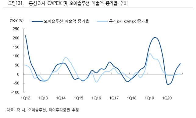 이 연구원은 “일반적으로 통신사의 연간 CAPEX의 60% 이상이 하반기에 집행되는데, 지난해의 경우 5G상용화를 앞두고 1분기부터 공격적으로 투자에 나섰기 때문에 오이솔루션의 실적이 큰 폭으로 성장했다”며 “올해는 하반기 28GHz 주파수 대역 투자와 5G SA 상용화를 앞두고 있어 수요가 재차 확대할 것”이라고 전망했다.