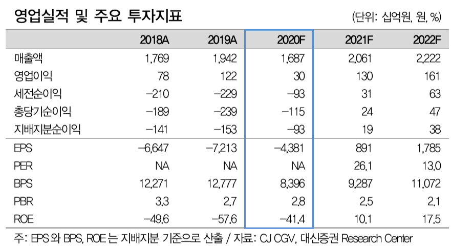 대신증권은 25일 CJ CGV에 대해 코로나19 직격탄을 맞았지만 연간 관객수는 -20% 수준으로 마감할 것으로 전망하며 투자의견 '매수'와 목표가 2만9000원을 유지했다.