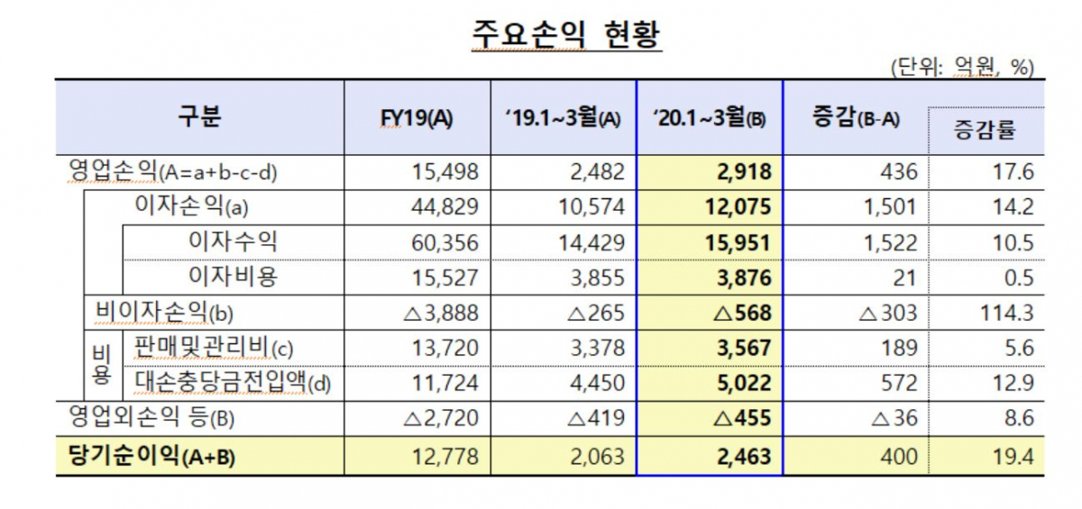 비이자손실과 대손충당금전입액이 증가했지만, 대출확대 등으로 이자손익(1501억 원)이 크게 증가하여 당기순이익이 확대됐다.