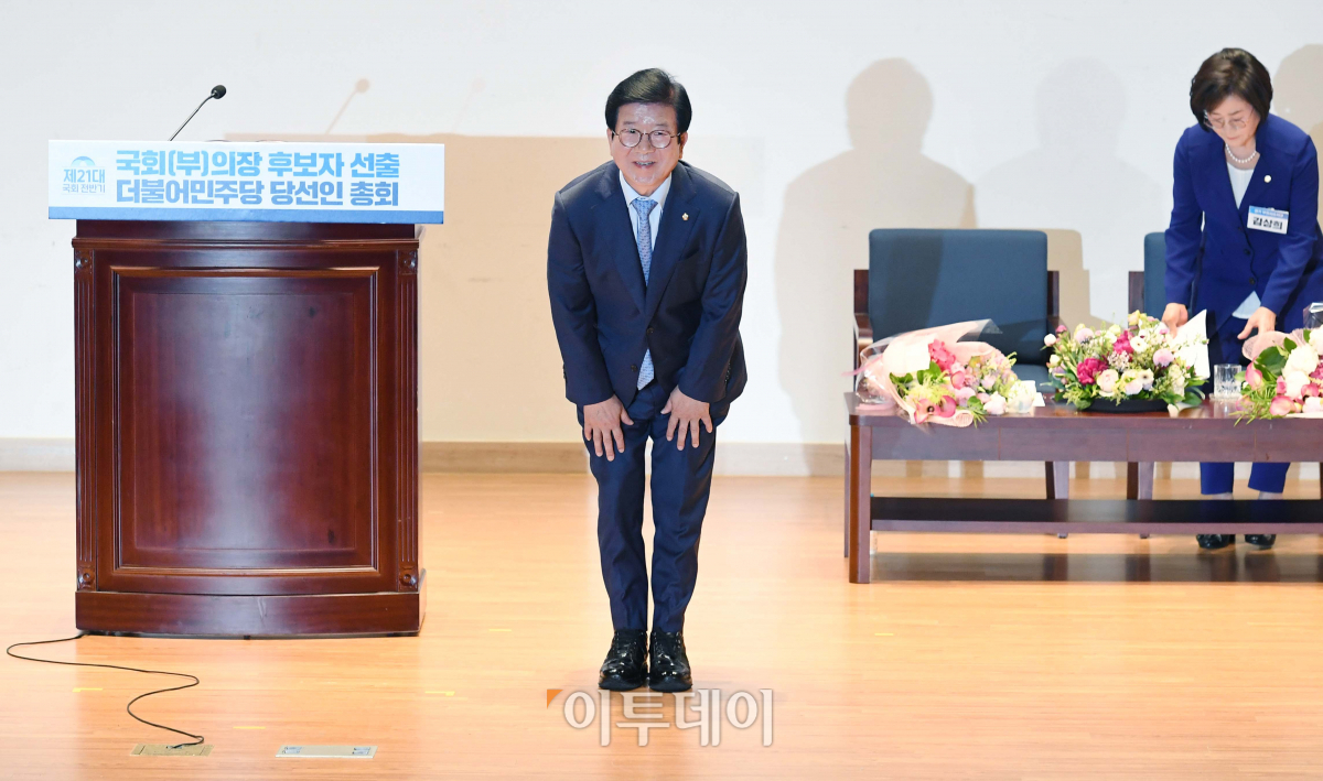 25일 서울 여의도 국회에서 열린 제21대 국회 전반기 국회(부)의장 더불어민주당 후보자 선출 당선인 총회에서 국회의장 후보로 선출된 박병석 의원이 인사하고 있다.