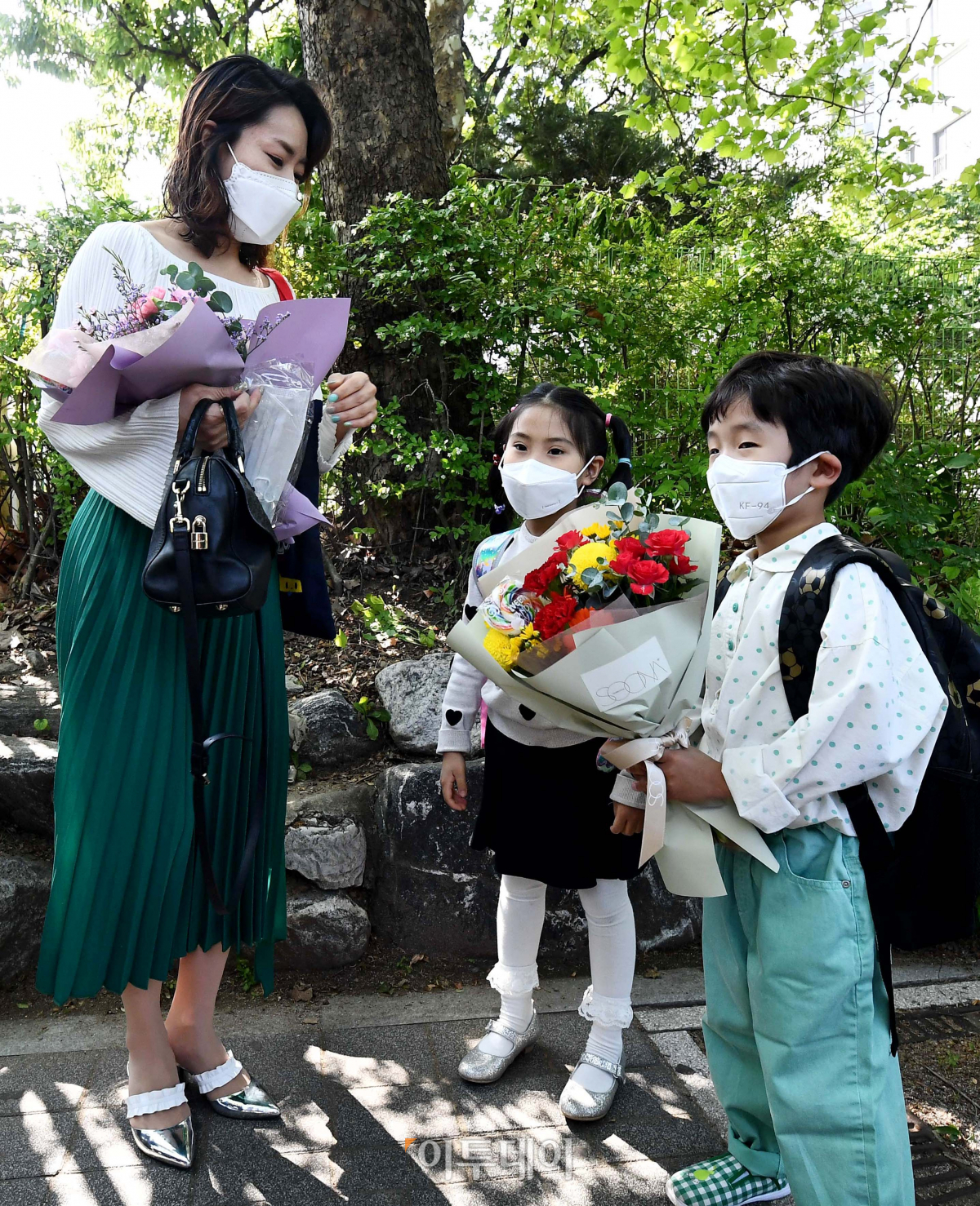 2차 등교개학 첫 날인 27일 서울 송파구 세륜초에서 초등학교 1·2학년 어린이들이 교실로 향하고 있다. 이날부터 전국 고등학교 2학년과 중학교 3학년, 초등학교 1·2학년, 유치원생 237만명이 등교 수업을 시작한다. 다만 서울과 경기, 경북 등 일부 학교와 유치원에서는 코로나19 확진자 발생, 접촉자 파악 등의 이유로 등교가 연기됐다.