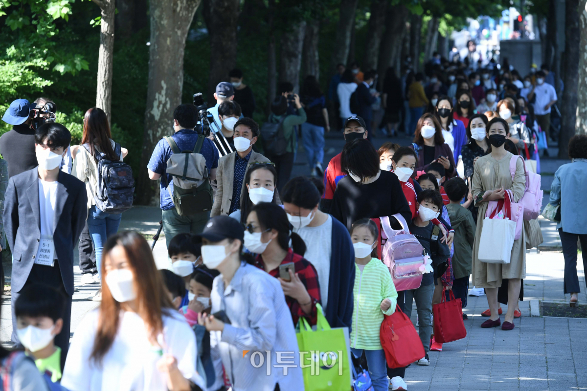 2차 등교개학 첫 날인 27일 서울 송파구 세륜초에서 초등학교 1·2학년 어린이들이 교실로 향하고 있다. 이날부터 전국 고등학교 2학년과 중학교 3학년, 초등학교 1·2학년, 유치원생 237만명이 등교 수업을 시작한다. 다만 서울과 경기, 경북 등 일부 학교와 유치원에서는 코로나19 확진자 발생, 접촉자 파악 등의 이유로 등교가 연기됐다.
