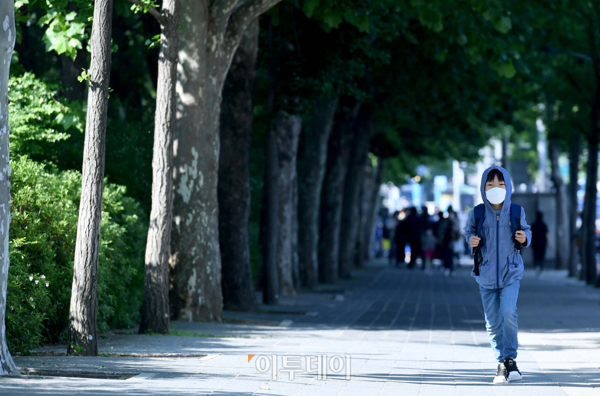 2차 등교개학 첫 날인 27일 서울 송파구 세륜초에서 한 어린이가 교실로 향하고 있다. 이날부터 전국 고등학교 2학년과 중학교 3학년, 초등학교 1·2학년, 유치원생 237만명이 등교 수업을 시작한다. 다만 서울과 경기, 경북 등 일부 학교와 유치원에서는 코로나19 확진자 발생, 접촉자 파악 등의 이유로 등교가 연기됐다.