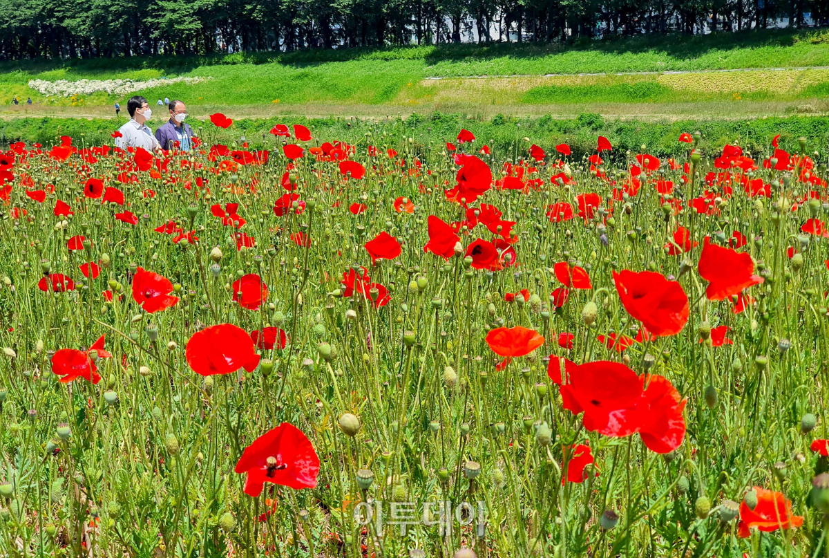 전국이 맑은 날씨를 보인 27일 경기 광명시 안양천변에 핀 꽃양귀비가 시민들의 눈길을 끌고 있다.