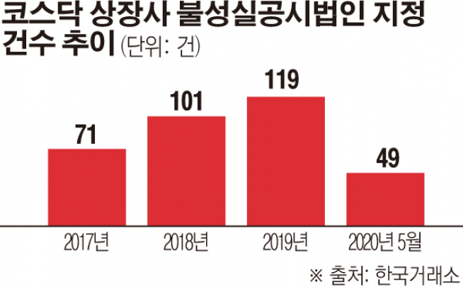 28일 한국거래소에 따르면 올해 들어 코스닥시장의 불성실공시법인 지정 건수는 49건으로 집계됐다. 사상 최대를 기록한 지난해의 같은 기간(50건)과 비슷한 수준이다.