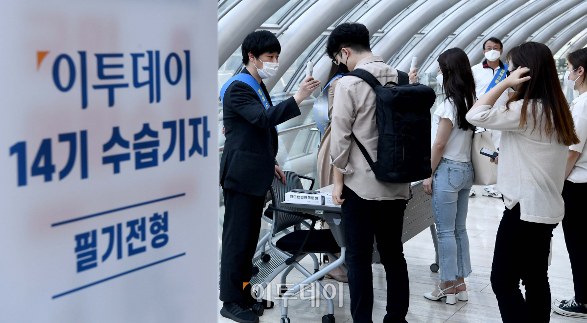 31일 서울 여의도 전경련회관 컨퍼런스센터에서 열린 이투데이 제14기 수습기자 공채 필기전형에 앞서 응시생들이 체온을 측정하고 있다. 신태현 기자 holjjak@