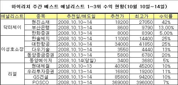 한편, 하이리치는 대한항공, 한솔제지, 동양종금증권, 다우기술, 동양메이저 등을 통해 각각 5~25% 가량의 수익률을 확보하며 주간 베스트 애널리스트 2위에 선정된 이성호소장이 22일 오전 9시 50분부터 11시까지 현 시장의 시장 주도주와 향후 증시 전반을 진단하는 무료특집방송을 실시한다고 밝히며 많은 참여를 당부했다.