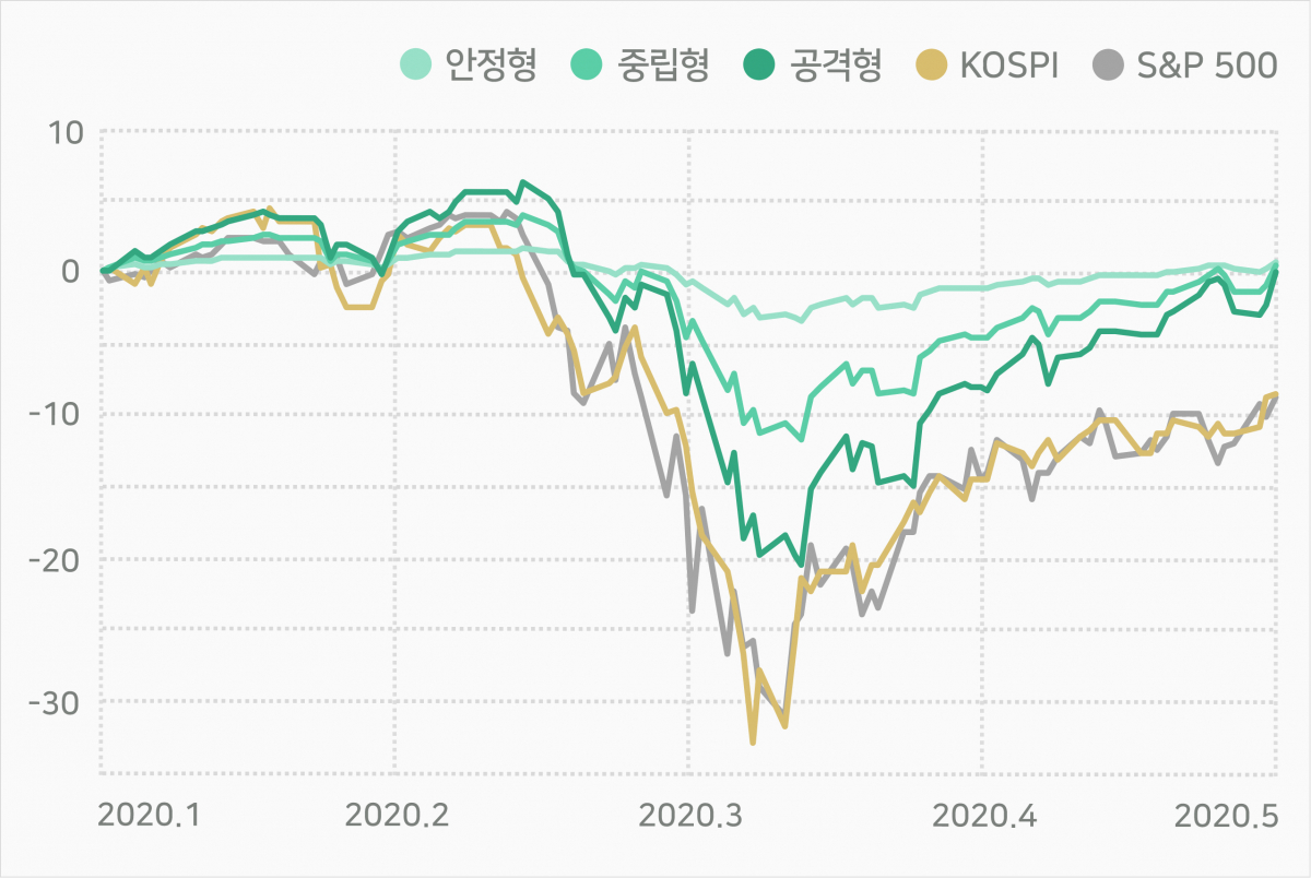 2일 파운트에 따르면 파운트의 공격형 펀드 포트폴리오는 올 초부터 5월20일까지 -0.1%의 수익률을 기록했다. 이 공격형 포트폴리오는 1월 초 상승세로 출발해 2월 5% 넘게 상승했으나 코로나19 확산으로 인해 고점에서 약 -25% 하락했다. 하지만 세계 각국에서 경기부양책이 시행되고 금융시장이 안정을 되찾으면서 5월 들어 연초 수준까지 회복했다.