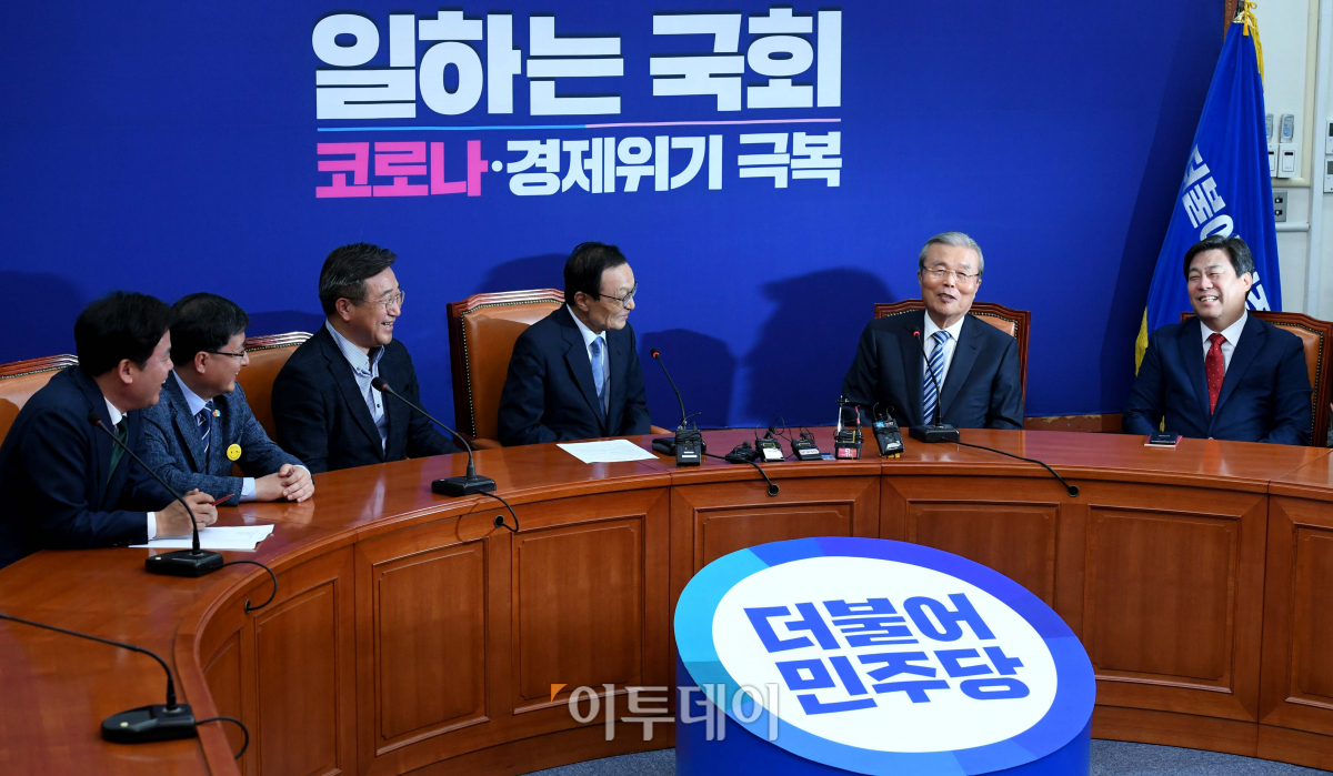 이해찬 더불어민주당 대표와 김종인 미래통합당 비상대책위원장이 3일 서울 여의도 국회에서 회동을 갖고 있다.
