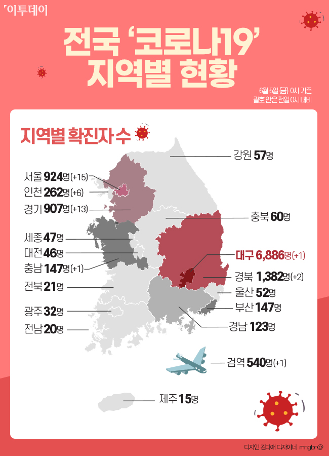 이로써 전국 시·도별 '코로나19' 확진자 수는 △대구 6886명 △경북 1382명으로 가장 많은 비중을 차지했다. 이어 △서울 924명 △경기 907명 △검역소 540명 △인천 262명 △부산 147명 △충남 147명 △경남 123명 △충북 60명 △강원 57명 △울산 52명 △세종 47명 △대전 46명 △광주 32명 △전북 21명 △전남 20명 △제주 15명 순으로 나타났다.