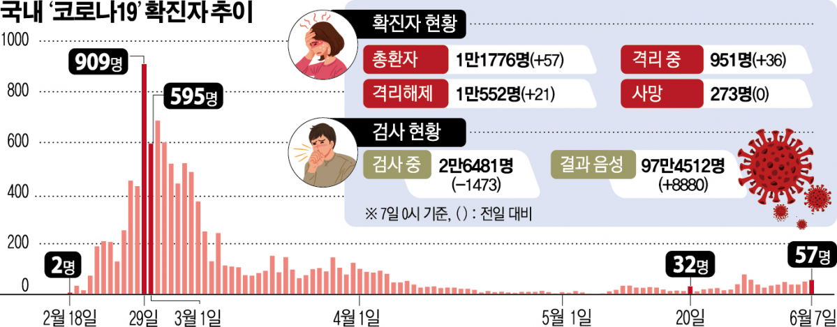 질병관리본부 중앙방역대책본부는 7일 0시 기준으로 코로나19 확진환자가 전날보다 57명 증가한 1만1776명으로 집계됐다고 밝혔다. 신규 확진자는 이틀째 50명을 웃돌았다. 종교모임을 중심으로 수도권에서 산발적인 집단감염이 이어지면서 최근 지역발생 현황은 사회적 거리 두기가 시작된 3월 말로 되돌아갔다. 감염경로 불명 비율도 늘어 역학조사에도 어려움이 계속되고 있다. 이런 추세라면 코로나19 발생은 증감을 반복하며 연말까지 이어질 것으로 보인다.
