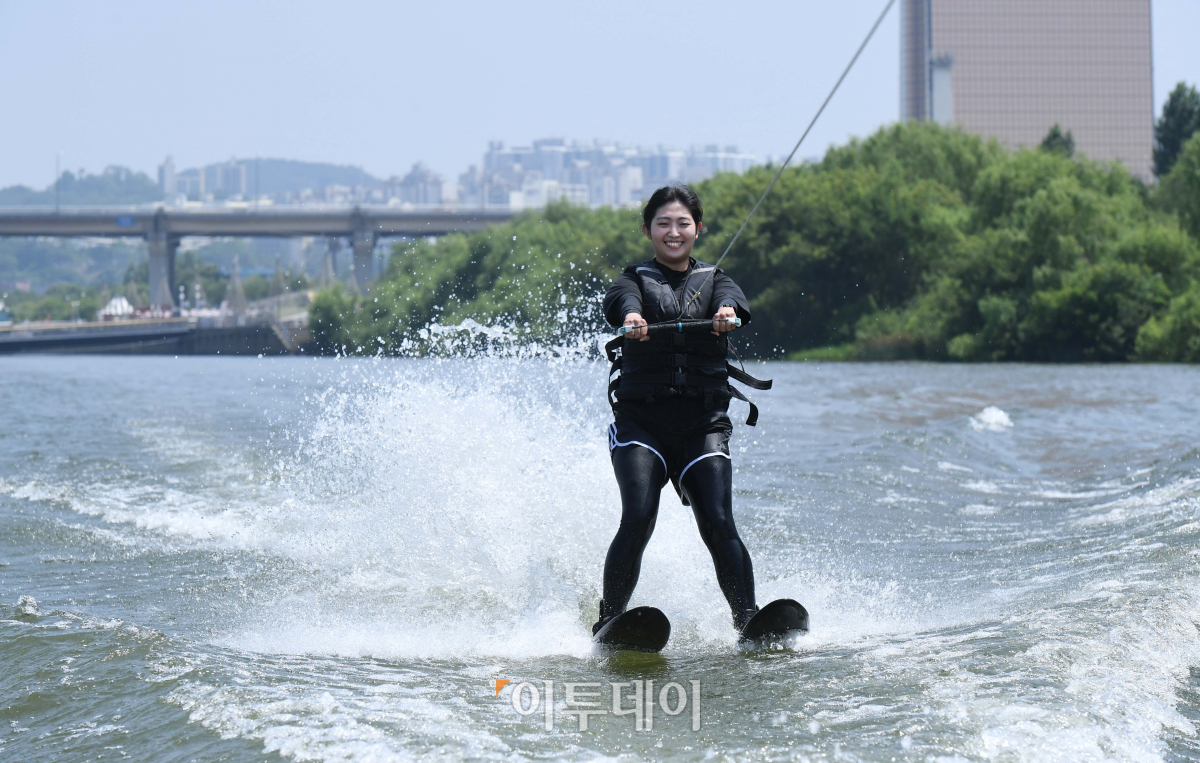 서울 낮 최고기온이 30도를 기록하는 등 전국이 초여름 날씨를 보인 7일 서울 여의도 한강레저스포츠에서 한 시민이 수상스키를 타며 더위를 식히고 있다. 기상청은 오는 8일 대구 낮기온이 34도를 나타내고 충북과 경북내륙지역에 폭염주의보를 발효하는 등 무더위가 계속될 것으로 예보했다.