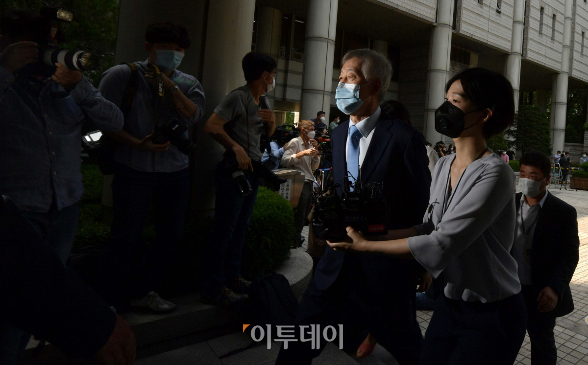 최지성 전 삼성그룹 미래전략실장이 8일 서울 서초구 서울중앙지방법원에서 열린 구속 전 피의자 심문(영장실질심사)에 출석하고 있다.