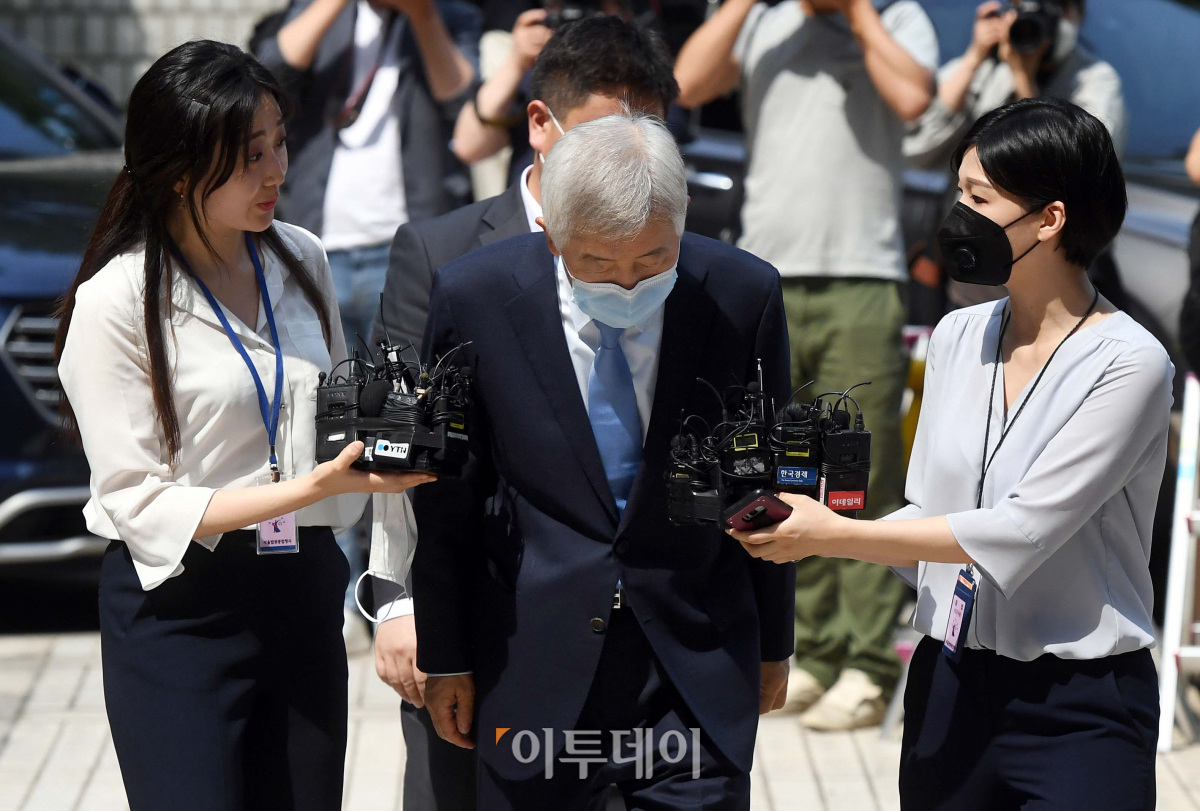 최지성 전 삼성그룹 미래전략실장이 8일 서울 서초구 서울중앙지방법원에서 열린 구속 전 피의자 심문(영장실질심사)에 출석하고 있다.