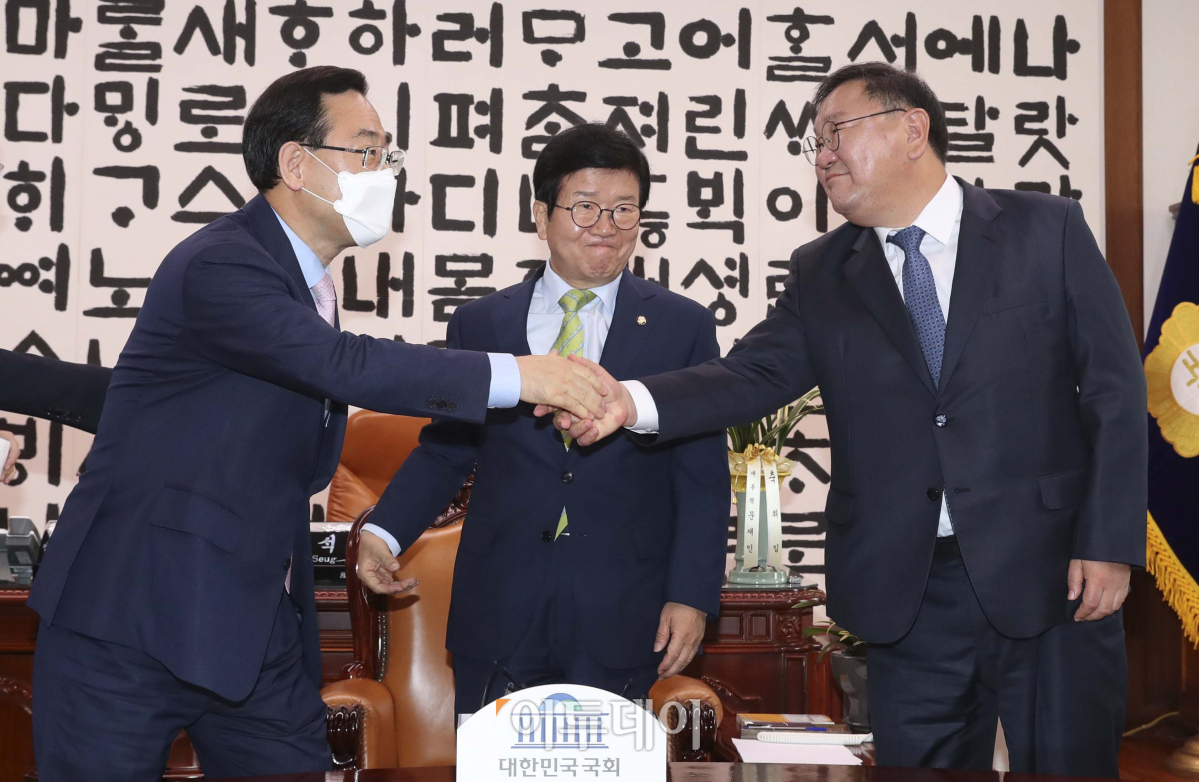 김태년(오른쪽) 더불어민주당 원내대표와 주호영 미래통합당 원내대표가 11일 서울 여의도 국회에서 박병석 국회의장 주재로 원구성 협상을 위해 열린 여야 원내대표 회동에서 악수하고 있다.