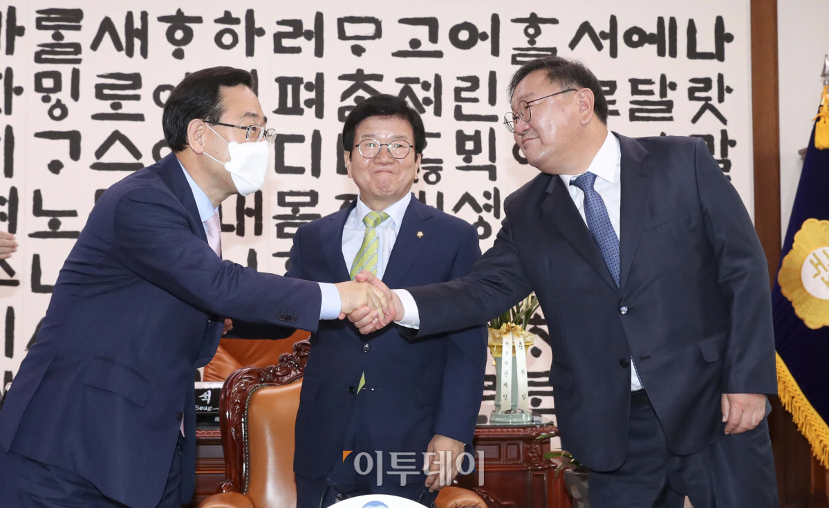 김태년(오른쪽) 더불어민주당 원내대표와 주호영 미래통합당 원내대표가 11일 서울 여의도 국회에서 박병석 국회의장 주재로 원구성 협상을 위해 열린 여야 원내대표 회동에서 악수하고 있다.