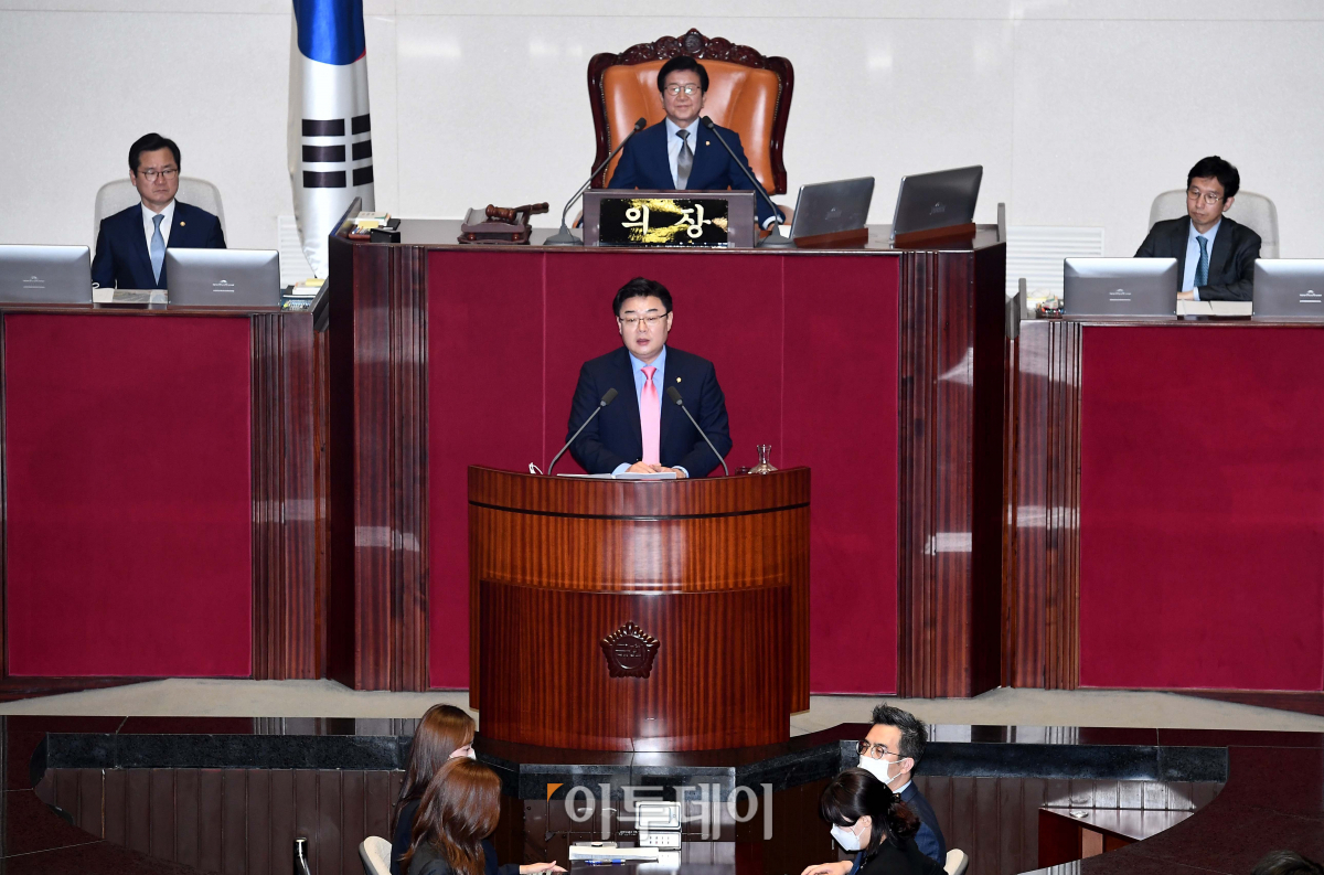 김성원 미래통합당 원내수석부대표가 12일 서울 여의도 국회에서 원구성을 위해 열린 본회의에서 의사진행발언을 하고 있다. 이날 예정됐던 21대 국회 상임위원장 선출은 오는 15일로 연기됐다.